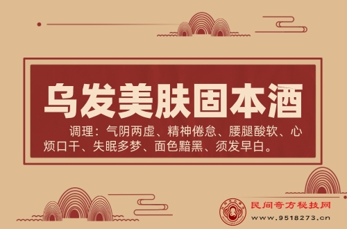 组成:山药、人参、五味子、天冬、麦冬、生地黄、熟地黄各60克,制首乌20克,黑桑葚干50克,黑枸杞50克!糯米酒2000毫升。用法:本药酒所用的药材均可从医院或药店购买到,上述中药饮片买回家后,晾晒一下,装入洁净纱布袋内,将药袋与糯米酒封存酒坛中。浸泡一个月后即可取酒饮用,每日早、晚各饮1次,每次20-30毫升。功效: