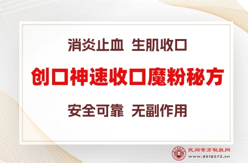 多种中药材打碎成粉,密封瓶装即可。永不变质,即消炎止血,又生肌收口,敢称神药。本秘方中药材如下儿茶15克、硼砂8克、地榆60克、侧柏叶40克、冰片5克、百草霜30克、黄柏40克。七种中药材配伍研末细粉,即成“魔粉”。组合药材均是止血消炎,生肌收口要药。优点:1、患者清洗伤口后外用,直接扑在伤处,自然接受,立马见效,不会