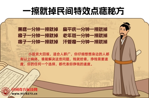 一擦就掉民间特效点痣秘方黑痣一分钟一擦就掉瘊子一分钟一擦就掉痦子一分钟一擦就掉雀斑一分钟一擦就掉扁平疣一分钟一擦就掉老年斑一分钟一擦就掉汗管瘤一分钟一擦就掉黑色素瘤一分钟一擦就掉尖锐湿疣一分钟一擦就掉小投资大回报,适合人群广,你仔细想想身边的人都有以上病体,谁能解决这些问题,钱就给谁,挣钱需要速度,你的任何一个选择,都